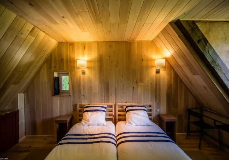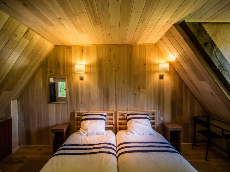 The eco-gîte nestled in the 4 ha park of the Domaine du Colombier is equipped for 6 people with 3 bedrooms (1X2pers, 4X1pers) including one accessible PMR room.